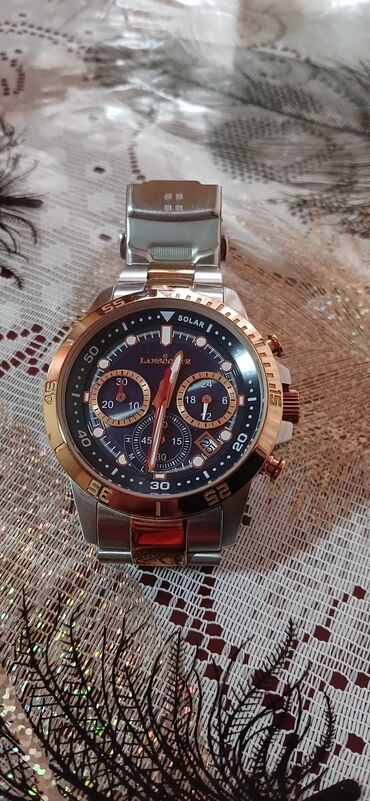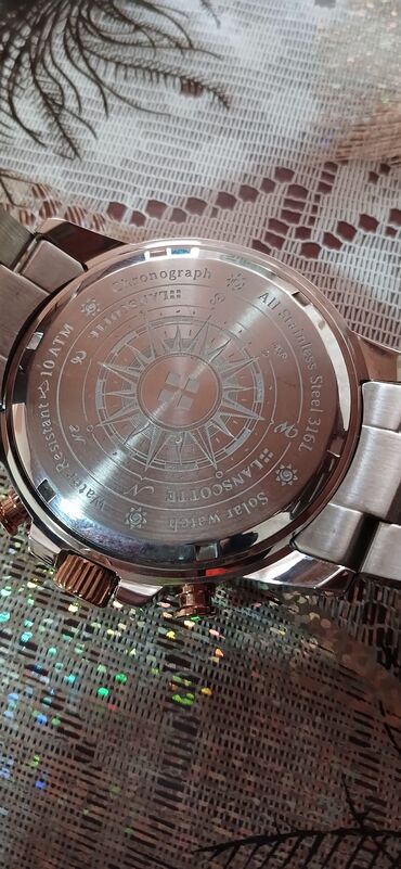 - Arxa qapaqda kompas naxışlı oyma və “All Stainless Steel 316L / Water Resistant 10 ATM / Chronograph / Solar Watch / LANSCOTTE” yazıları