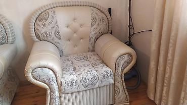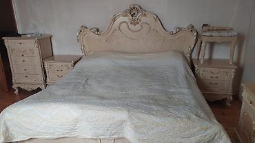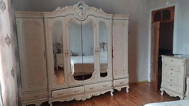 Klassik üslublu dəst mebellər 1) Yataq otağı dəsti: - Yüksək başlıqlı, kapitone işləməli, krem rəngli və qızılı dekorlu böyük çarpayı - İki ədəd tumba - Geniş şkaf: sürüşkən qapılı, güzgülü, alt h...