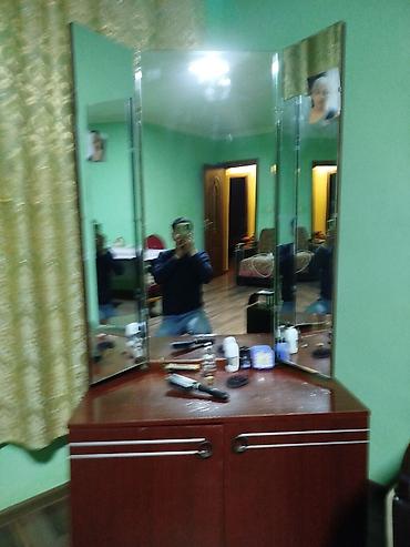 Taxtadan hazırlanmış güzgülü makiyaj/tuvalet masası - Klassik tərzdə, qəhvəyi rəngli korpus - Üç hissəli böyük güzgü: mərkəzi geniş panel və iki yan tənzimlənən qanad - Geniş üst səth: makiyaj, ət...