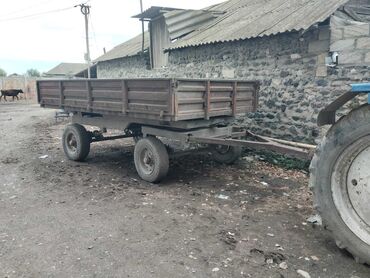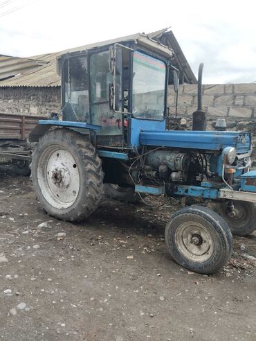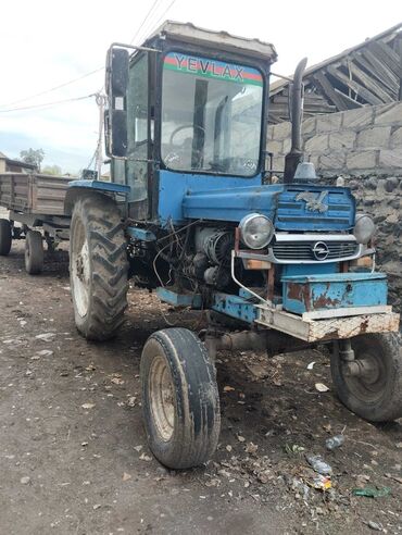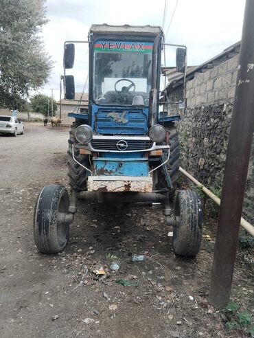 Mavi rəngli traktor, arxa qoşqu çəkmək üçün hazır qurğulu. Kabinli, geniş ön və yan güzgülər, sağ-sol siqnal və işıqlar görünür. Ön tərəfdə hidravlik qollar/çəngəllər üçün montaj nöqtələri və qoşqu mexanizmi var. Arxa hissədə iri protektorlu təkərlər, öndə dar təkər komplekti ilə tarlada və təsərrüfatda işlərə uyğun. Kabin şüşələri tam, küləkönü şüşədə yuxarıda nömrə yeri mövcuddur. Yanlardan zəncirli bərkidilmə nöqtələri görünür. Traktor hal-hazırda qoşquya bərkidilmiş vəziyyətdədir və kənd təsərrüfatı, yüklərin daşınması, torpaq işləri, sahə becərilməsi üçün münasibdir.