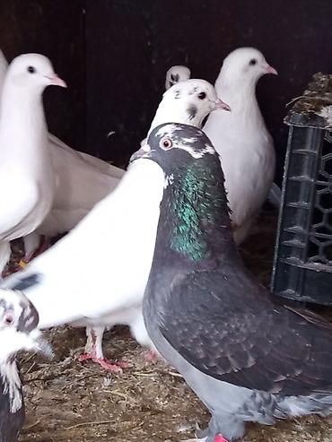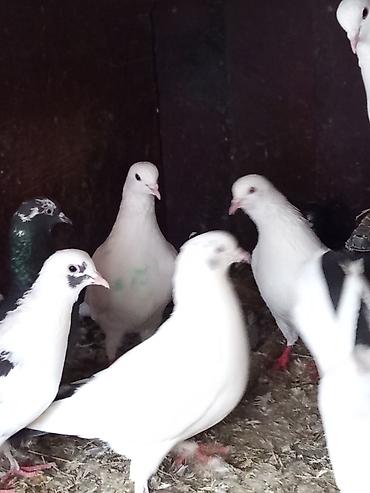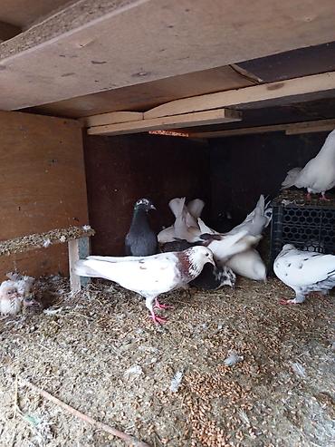 Qüvvətli uçuşlu ev göyərçinləri – müxtəlif rənglərdə - Növlər və rənglər: ağ, qara, boz, ağ-qara ləkəli və qəhvəyi variasiyalar. - Say: şəkillərdə çoxsaylı fərdlər görünür; cüt-cüt saxlamaya və sü...