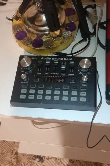 - Xarici səs kartı: “Audio Sound Card X-M15 Pro” (üzərində qeyd olunub) – treble/bass, sound‑effect, music, monitor üçün sürüşdürmə tənzimləyicilər; mic/record/reverb səviyyə nobs; bir neçə səs effekt düyməsi; 3.5 mm giriş‑çıxışlar.
