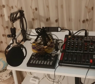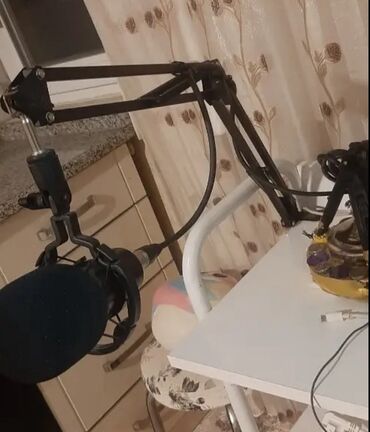 - Kondensator mikrofon: pop‑filtr və elastik şok‑mount ilə; masaya bərkidilən tənzimlənən qollu boom‑arm.