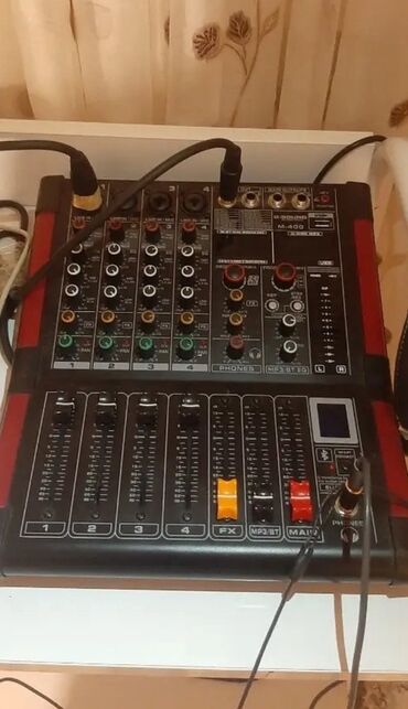 - Mikser: 4 kanallı (1–4) sürgülü faderlər, gain/EQ (high‑mid‑low), PAN, FX bölməsi, AUX/FX send, solo/phones idarəsi, MP3/BT modulu, USB, monitor və qulaqcıq çıxışları. Ön paneldə səviyyə indikatoru və ayrı MAIN fader.
