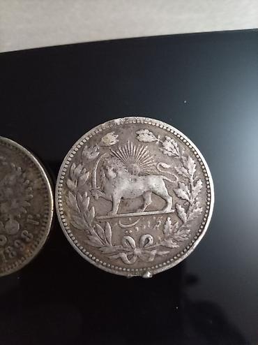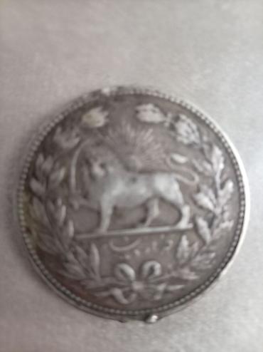 - Qacarlar dövrünə aid İran sikkəsi (gümüş rəngli). Bir üzündə ərəb-fars xətti ilə yazılar və tac təsviri, ətrafı yarpaq çələngi ilə bəzədilib. Digər üzündə Günəş və Şir rəmzi, altda farsca tarix/yazı, kənarı muncuqlu haşiyə ilə işlənib.