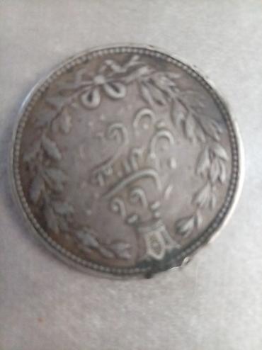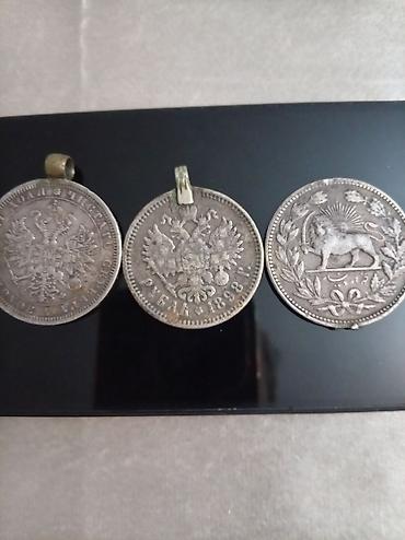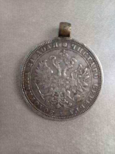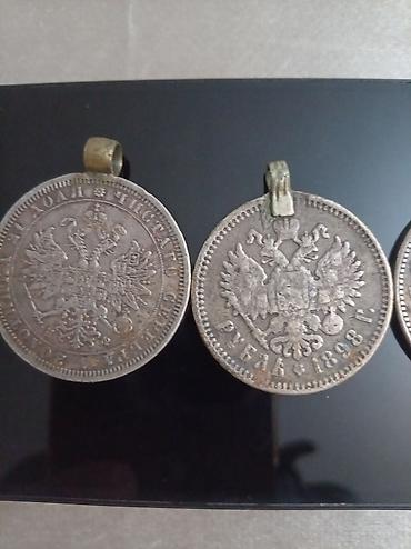 - Rusiya imperiyası rublu (gümüş rəngli), üzərində iki başlı qartal gerbi və kiril əlifbası ilə yazılar. Kənarında asma halqası mövcuddur, medalion kimi taxmaq üçün uyğundur. Digər tərəfində böyük “РУБЛЬ” yazısı və yarpaq çələngi naxışı görünür.