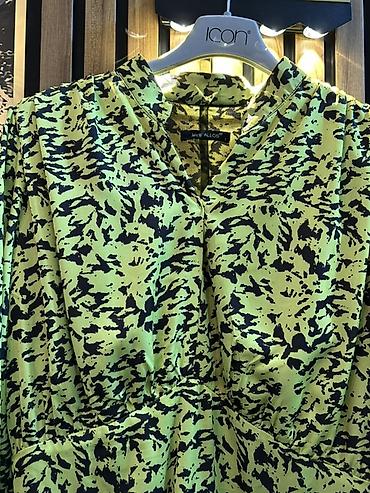 - Rəng və naxış: Açıq yaşıl əsas üzərində qara abstrakt/“splaş” print