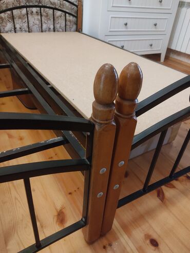 - Konstruksiya: qalın metal profildən karkas, başlıq və ayaqlıqda dekorativ qara metal barmaqlıqlar