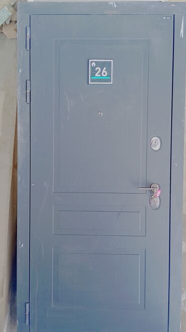 Metall giriş qapısı - Material: polad/metal vərəq, boz rəngli boya örtüyü - Ölçü: standart mənzil giriş qapısı ölçüləri (təxminən 90×200 sm; dəqiq ölçü üçün fərdi yoxlama tələb oluna bilər) - Akse...
