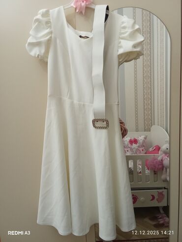 Ağ rəngdə zərif qadın paltarı. - Dizayn: kvadrat dekolte, bel xəttini vurğulayan enli kəmər detalı. - Bəzək: kəmərin yan hissəsində mirvari aplikasiya. - Qol: çiyində yüngül həcm verilmiş, manjetl...