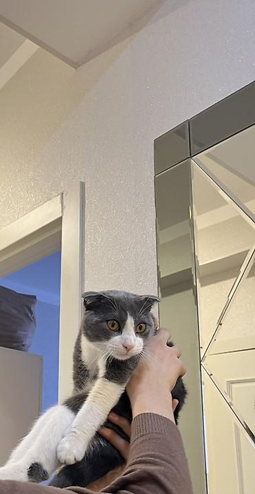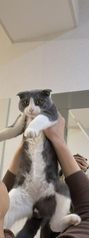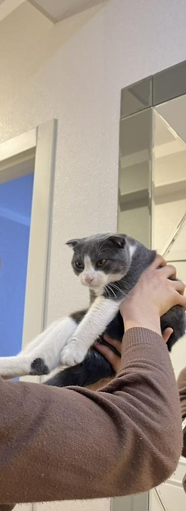 Şotland qıvrım qulaqlı pişik (Scottish Fold) – gözəl boz-ağ rəngli - Cins: Scottish Fold (qıvrım qulaqlı) - Rəng: boz-ağ bicolor, burnunda və sinəsində ağ naxış - Gözlər: iri, qızılı - Xəz: qısa v...