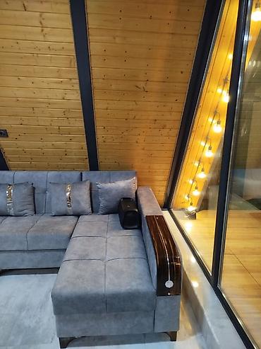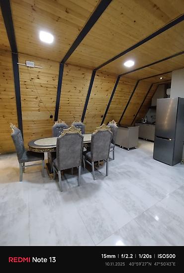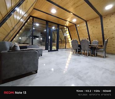 - Panorama şüşəli əsas zal: yumşaq künc divan, 6 nəfərlik nahar masası, ağac üzlü tavan və metal karkas detallar, parlaq mərmər tipli döşəmə.