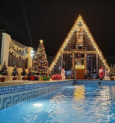 A-frame üslubunda rahat dağ kotteci – geniş həyət və işıqlı dekorlarla. Həyətdə mozaik kafelli işıqlı üzgüçülük hovuzu, Yeni il tematik bəzəklər, şam ağacları və oturma zonası. Ön fasadda şüşəli giriş, çardaqvari siluet və LED qirlyandalar.