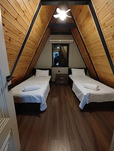 - 2 ayrı yataq otağı: təmiz dəstlərlə iki nəfərlik çarpayılar, ağac obşivka, isti işıqlandırma.