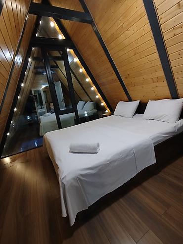 - Mansard zonasında əlavə yataq sahəsi: A-formalı tavan altında böyük çarpayı, dekorativ işıq zənciri, şüşə arakəsmələr.