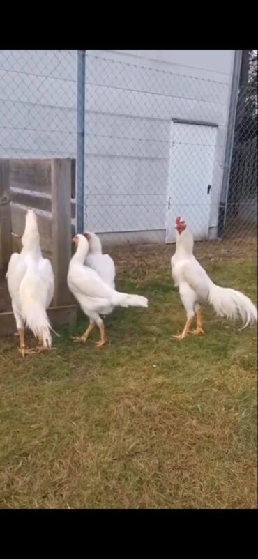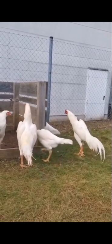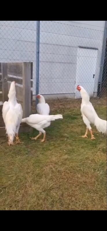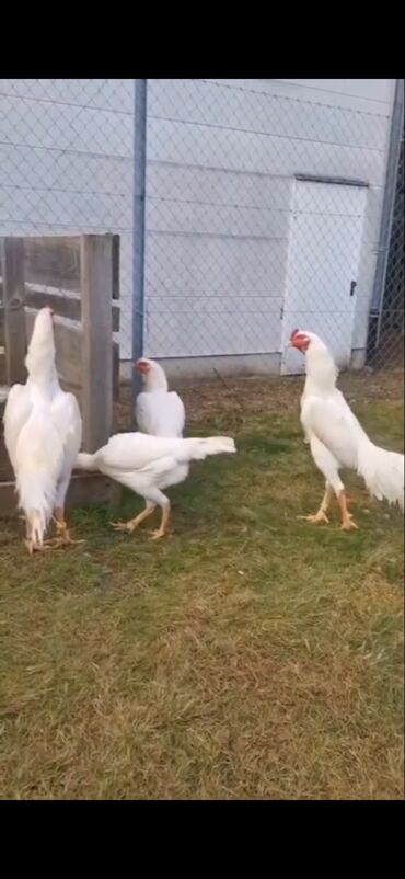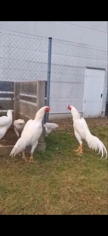 Ağ rəngli uzunboylu döyüş tipli toyuqlar (ehtimalən Azil/Şamo xətti).