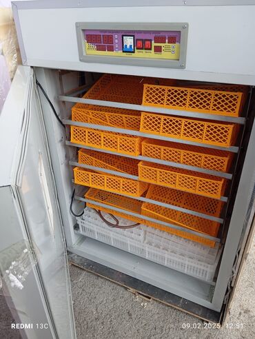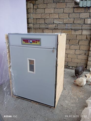 - Şəkillərdə quş yumurtalarının çıxarılması üçün iri həcmli, şaquli tip inkubator görünür. Ön qapıda kiçik baxış pəncərəsi var, üst paneldə rəqəmsal idarəetmə bloku (temperatur/nəmlik göstəriciləri, işıq indikatorları, idarə düymələri) yerləşir. Korpus metal/kompozit materialdan, qapı kilidi və havalandırma pəncərəsi ilə. Daxildə yumurta kasetləri/çəkməcələri üçün bölmələr nəzərdə tutulub.