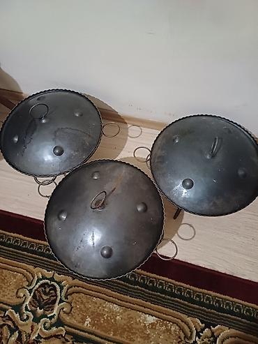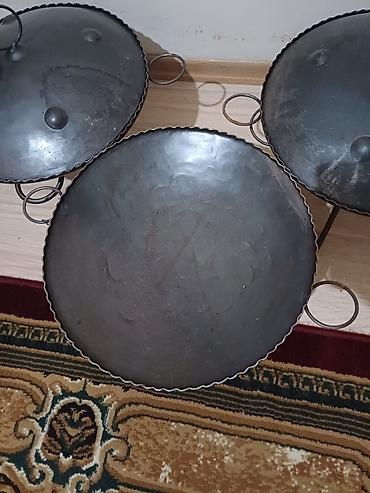 Satılır: Dəmir saç və saç üçün ayaqaltılıq/tava komplektləri Məhsul: - Dəmir saç. İki qulp, od/kömür üstündə bişirməyə uyğundur. - Saç üçün metal ayaqaltılıq (3 ayaqlı). - Saçın üzərinə qoyulan me...
