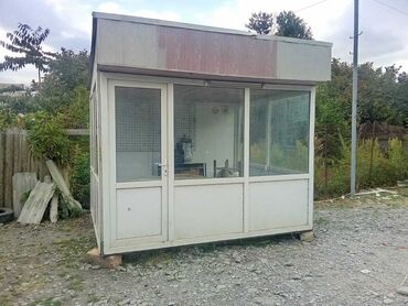 Portativ mühafizə/kassa köşkü - Material: metal karkas, PVC panellər və şüşə pəncərələr - Ölçü təxmini: 2 x 2 m (hündürlük ~2,2–2,4 m) - Konstruksiya: dörd tərəfi pəncərəli, yan giriş qapısı, ön h...