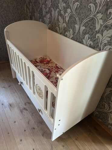 - Məhsul: Beşik/uşaq çarpayısı - Material: Ağ rəngli MDF/taxta konstruksiya - Dizayn: Qızılı dekor elementləri və düymələri, ön paneldə oymalı ornament; iç hissədə düyməciklərlə bəzədilmiş kapitone...
