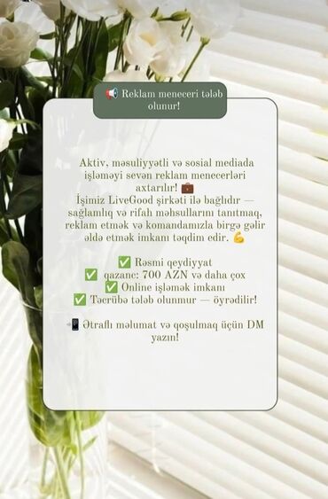 - Tələblər: Aktiv və məsuliyyətli olmaq, sosial mediada işləməyi sevmək. Təcrübə tələb olunmur — öyrədilir.