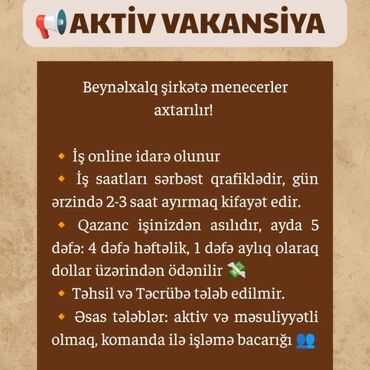 - İş tamamilə onlayndır; sərbəst qrafik, gün ərzində 2–3 saat ayırmaq kifayətdir