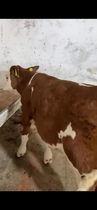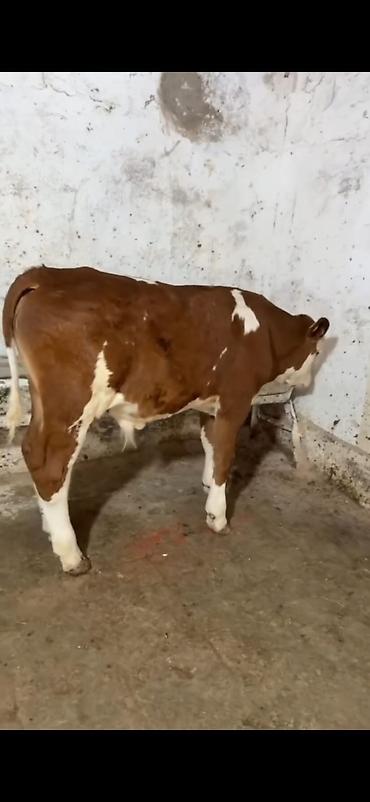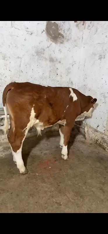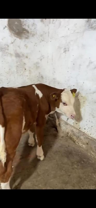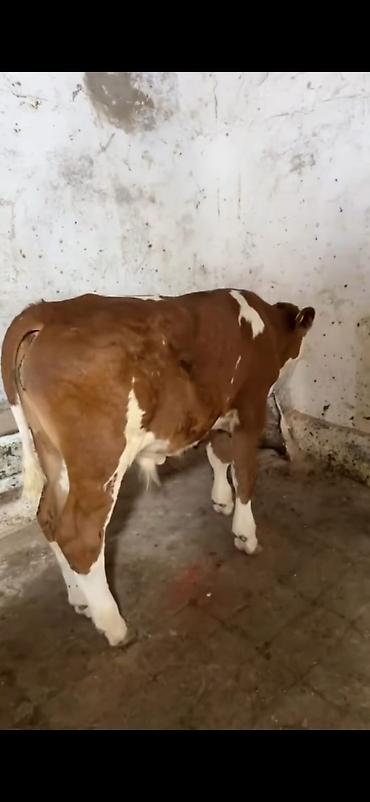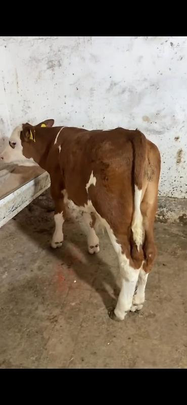 Simental tipli dişi buzov/malla – qırmızı-ağ rəngli, ləkəli naxışlı. Orta boylu, sağlam bədən quruluşu, düz ayaqlar və enli döş qəfəsi görünür. Boyun hissəsində dəmir zəncir bağlaması var, təsərrüf...