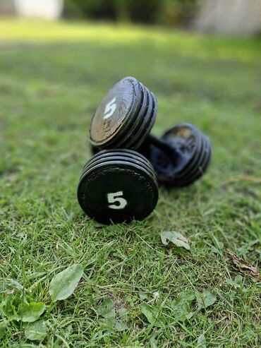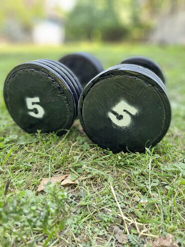 Teze gantel satilir 5.5 kglig.Tezedi islenilmeyib.Ici betondu,tutacagi demir,etrafi plasmasdi.20 azn