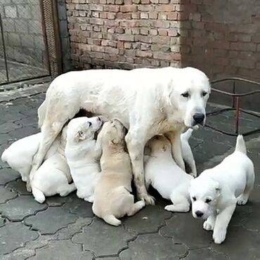 Məhsul: Orta Asiya çoban iti (Alabay) – ağ rəngli balalar və yetkin itlər Xüsusiyyətlər: - Cins: Orta Asiya çoban iti (Alabay) - Rəng: Tam ağ - Balalar və valideynləri birlikdə göstərilib - Güclü ...