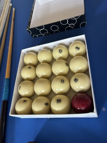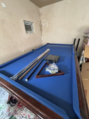 Bilard masası – tam dəst - Ölçü: böyük ölçülü klassik bilard masası (taxta karkas, 6 cib). - Örtük: yaşıl feldspa/felt səth, taxta bortlar. - Karkas: massiv ağac ayaqlar, sabit dayaq. - Ciblər: şə...