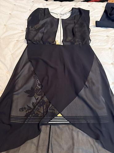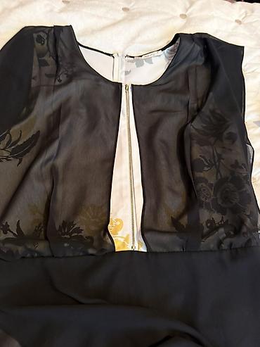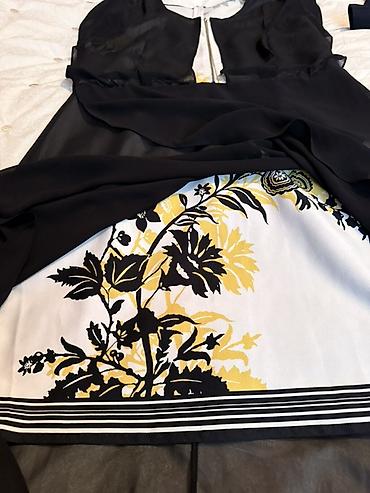 - Rəng və dizayn: Qara əsaslı, alt qatında ağ fon üzərində sarı və qara botanik/çiçək printi. Alt hissədə nazik qara-ağ zolaqlı haşiyə. Üstdə transparan şifon laylar, asimmetrik örtülü ətək effekti yaradır.