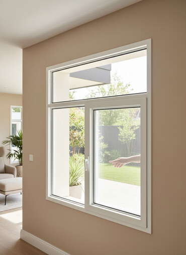 Ağ rəngli PVC profil şüşəbənd/qapı-pəncərə sistemi. Xüsusiyyətlər: - Üç hissəli konstruksiya: yuxarıda dar transom (sabit), aşağıda iki böyük şüşəli qanad. - Orta şaquli sütunlu çərçivə; mərkəzdə ...