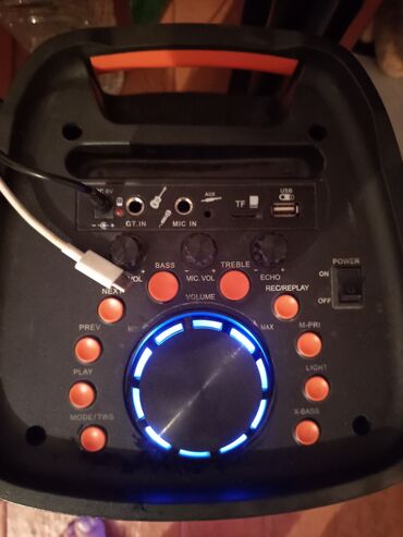 - Üst paneldə idarəetmə: böyük işıqlı səs tənzimləmə düyməsi, BASS və TREBLE, mikrofon səsi (MIC VOL), ECHO, X-BASS, işıq (LIGHT), NEXT/PREV/PLAY, MODE/TWS, REC/REPLAY, M-PRI, ON/OFF açarı