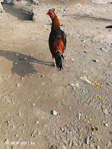 Məhsul: Qırmızı-qara rəngli xoruz (uzun quyruqlu), yanında bir dişi toyuqla birlikdə təsvir olunub. Xüsusiyyətlər: - Rəng: Parlaq qırmızı baş-boyun lələkləri, kürək və qanadlarda tünd qırmızı çala...