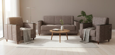 Qonaq otağı üçün dəst: 1 divan + 2 kreslo - Üslub: Klassik-modern kombinasiya - Materiallar: - Oturacaq və arxa hissə – qalın toxumalı parçadan yumşaq süngərli döşəmə - Karkas – möhkəm korpus...