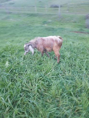 Cins: Uzun tüklü yerli keçi (erkək) Təsvir: - Güclü bədən quruluşu, uzun və parlaq krem rəngli yunu - Böyük, arxaya doğru qıvrılan buynuzlar - Boyunluq və zəncirə vərdişlidir, bağda və ya tövlədə s...