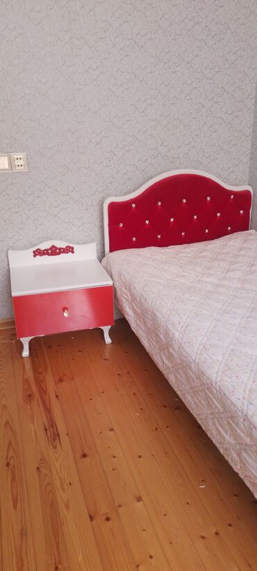 - Çarpayı: ağ karkaslı, qırmızı başlıq hissəsi kapitone naxışlı və bəzək daşı detalları ilə. Döşək daxildir (ağ parça üzərində bənövşəyi çiçək naxışlı).