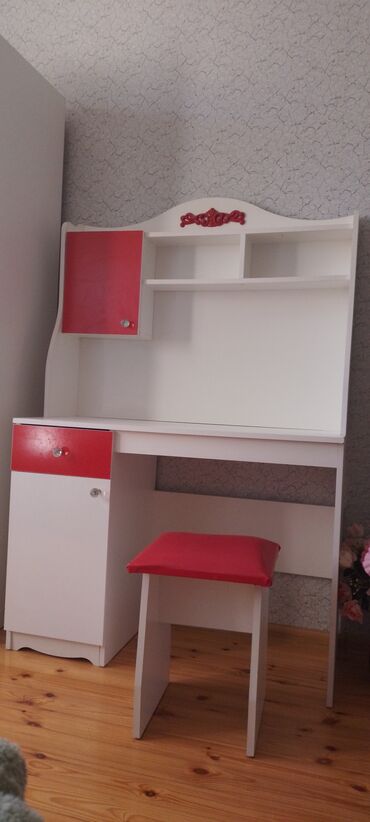 - Yazı masası: üst rəfli və yan qapılı/çəkmecəli model, ağ-qırmızı kombinasiya, üst hissədə açıq rəflər və kiçik şkaf qapısı; komplektdə qırmızı oturacaqlı stul-taburet.
