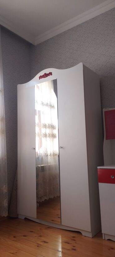 - Dolab: 3 qapılı ağ şkaf, mərkəzi qapıda boy güzgüsü, yuxarı hissədə qırmızı dekor elementləri.