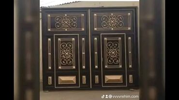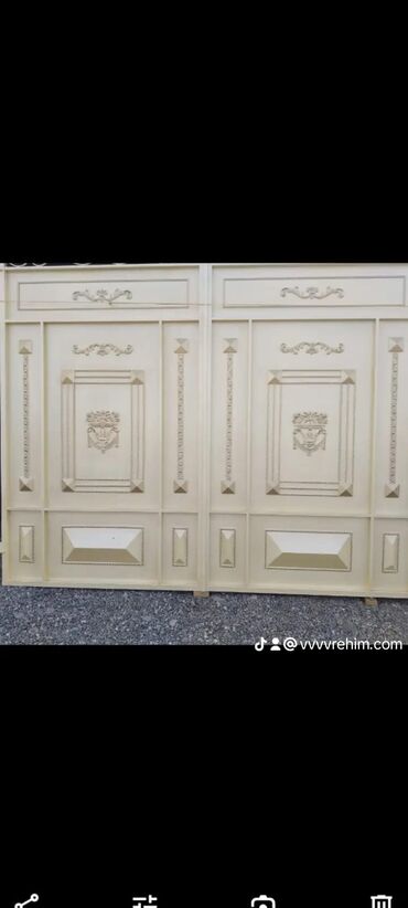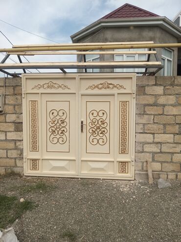 1) Krem rəngli, qızılı ornamentli, simmetrik ferforje mərkəzli darvaza.