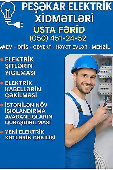 ELEKTRİK XİDMƏTLƏRİ BÜTÜN NÖV ELEKTRİK XİDMƏTLƏRİNİN GÖRÜLMƏSİ * Bütün növ elektrik işlərinin görülməsi, * Sifirdan evlerin ve binalarin həmçinin obyektlərin elektrik sisteminin çəkilməsi, * Raz...