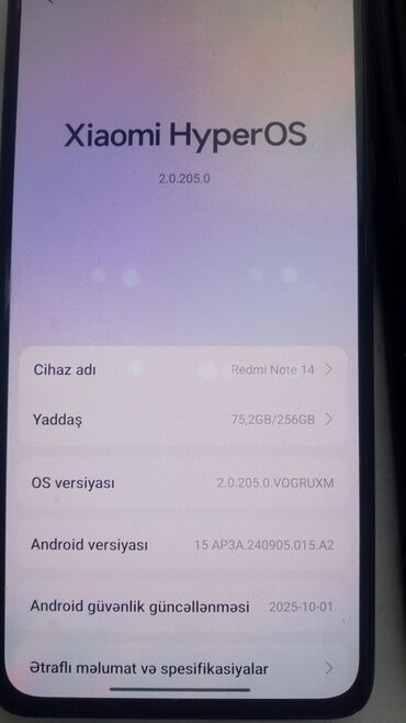 Xiaomi Redmi Note 14 Pro – HyperOS 2.0.209.0 ilə Əsas xüsusiyyətlər: - Yaddaş: 256 GB daxili yaddaş (göstərilən sərbəst: təxminən 56,6 GB istifadə edilib) - OS: Xiaomi HyperOS 2.0.209.0 (V0FMIXM) ...