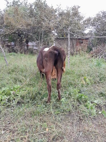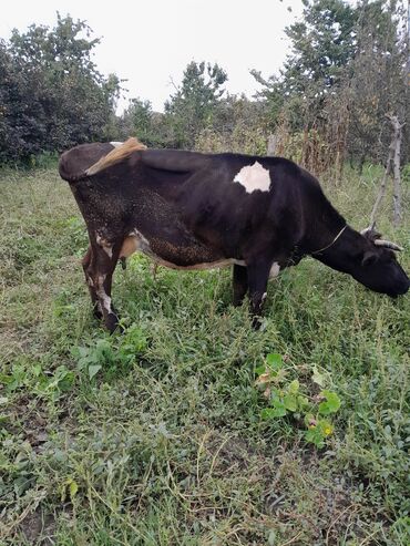 Satılır: inək 3aylığ erkək balası var - Cins: simental (şəkildə göründüyü kimi, qəhvəyi rəng, alnı açıq rəngli) - Buynuzlu, sakit xasiyyətli, otlaqda rahat güdülür - Sağım üçün münasib, süd və bu...