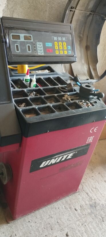 - Təkər balanslama aparatı: Unite markalı, EAC/CE işarəli elektron balanslaşdırma stendi. Rəqəmsal göstəricilər və idarə paneli, avtomatik ölçü düymələri, klavişli proqram seçimləri, çarx ölçüləri üzrə tənzimləmə imkanı. Üst hissədə xırda detalları saxlamaq üçün gözlü bölmələr, şaft və sıxac elementləri mövcuddur.