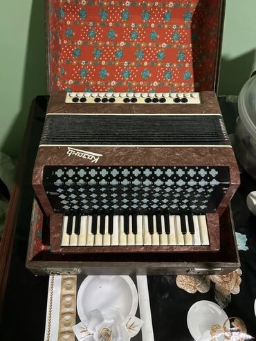 Satılır: Elektron qoşulma çıxışı olan nağara dilləri tipli klavişli-qarmon (sintezator klavişli harmonika) Xüsusiyyətlər: - Üst paneldə piano tipli dar klavişlər (ağ-qara), yuxarıdan açılan qatlan...