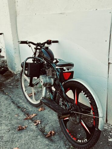 Mühərrikli velosiped - Çərçivə: klassik dağ velosipedi tipli, qara rəngdə - Mühərrik: benzinlə işləyən daxiliyanma mühərriki (2T tipli görünür), yanacaq çəni üst boruda - Egzoz sistemi: yan tərəfd...