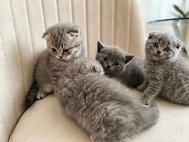 Skottiş Fold balaları – boz (blue/grey) rəng - Cins: Scottish Fold (qatlanmış qulaqlar) - Rəng: vahid boz (blue), yumşaq, sıx və parlaq yun - Gözlər: iri, ifadəli - Xarakter: mehriban, sakit, insa...