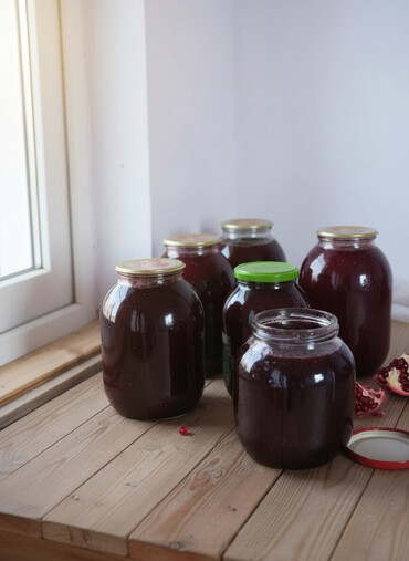 Qırmızı qapaqlı şüşə qabda ev üsulu nar mürəbbəsi/püresi. - Tərkibi