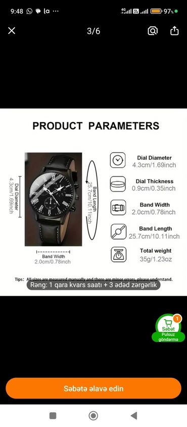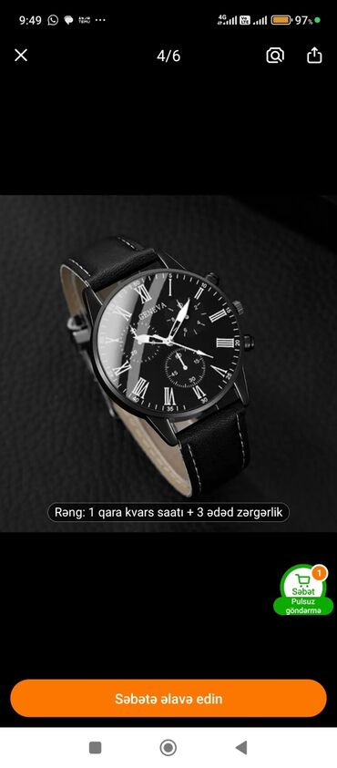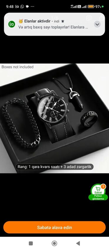 - Rəng: 1 qara kvarslı saat + 3 ədəd zərgərlik kimi göstərildiyi kimidir.