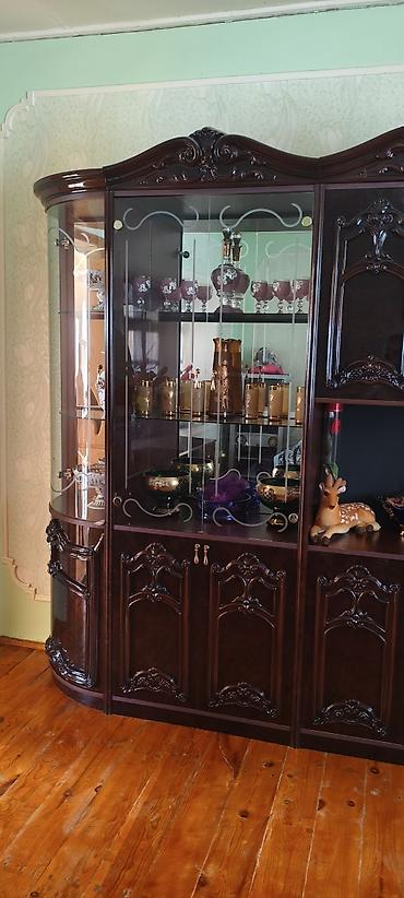 - Qonaq otağı üçün vitrinli bufet: tünd qəhvəyi rəng, parlaq laklı səth, dekorativ oyma taxta elementlər, şüşə vitrin qapıları və şüşə rəflər. Orta hissə düz, yan hissələr yumru formadadır. Aşağıda bağlanan dolab bölmələri, yuxarıda şüşəli hissədə qab-qacaq üçün geniş nümayiş sahəsi.